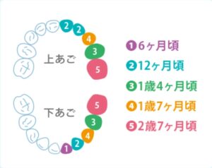 だいたい2歳半〜3歳ごろまでに、上下合わせて20本の乳歯が生えそろうのが目安です。