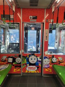 車両の外観だけでなく、車内の壁や日よけのブラインド、中吊り広告までトーマス一色。